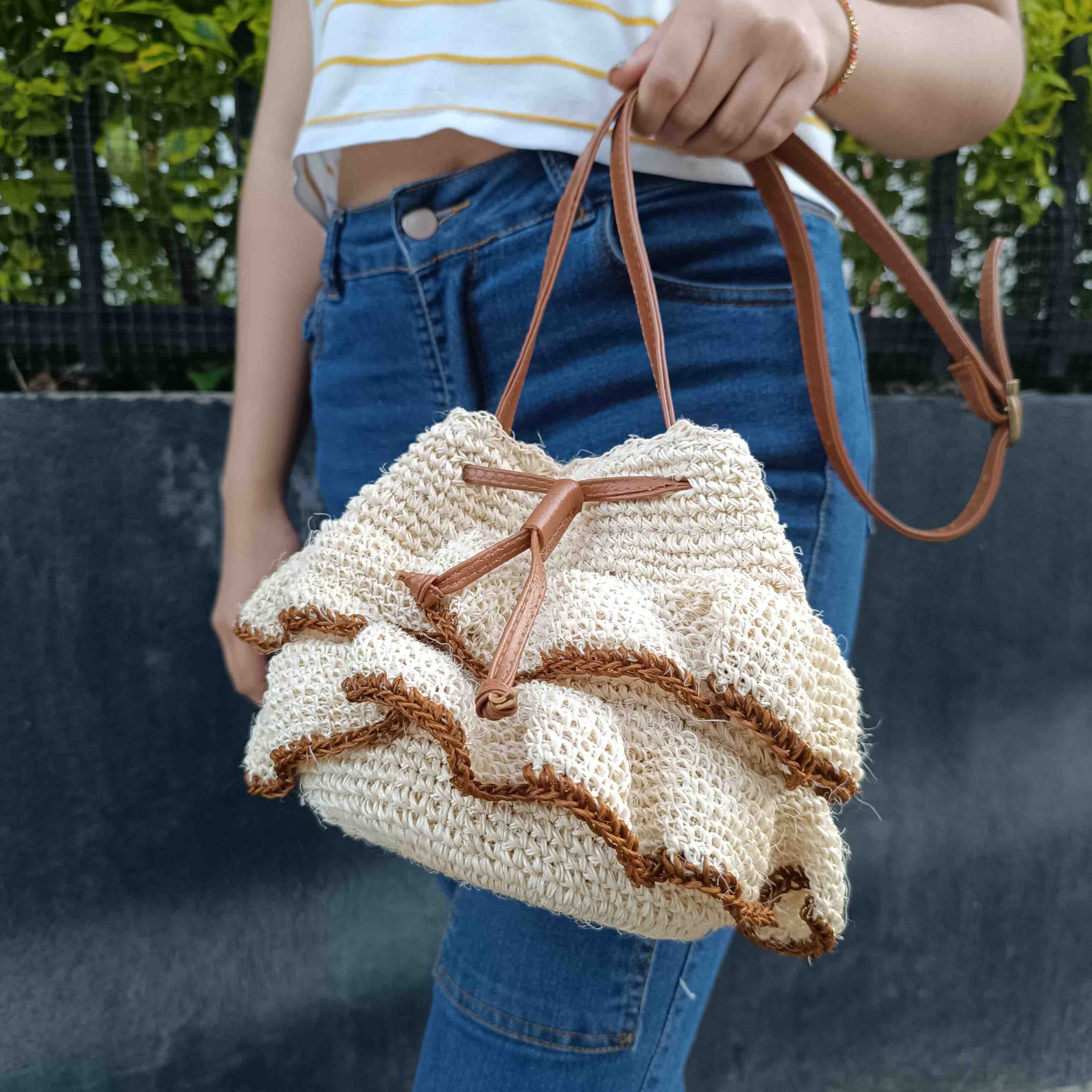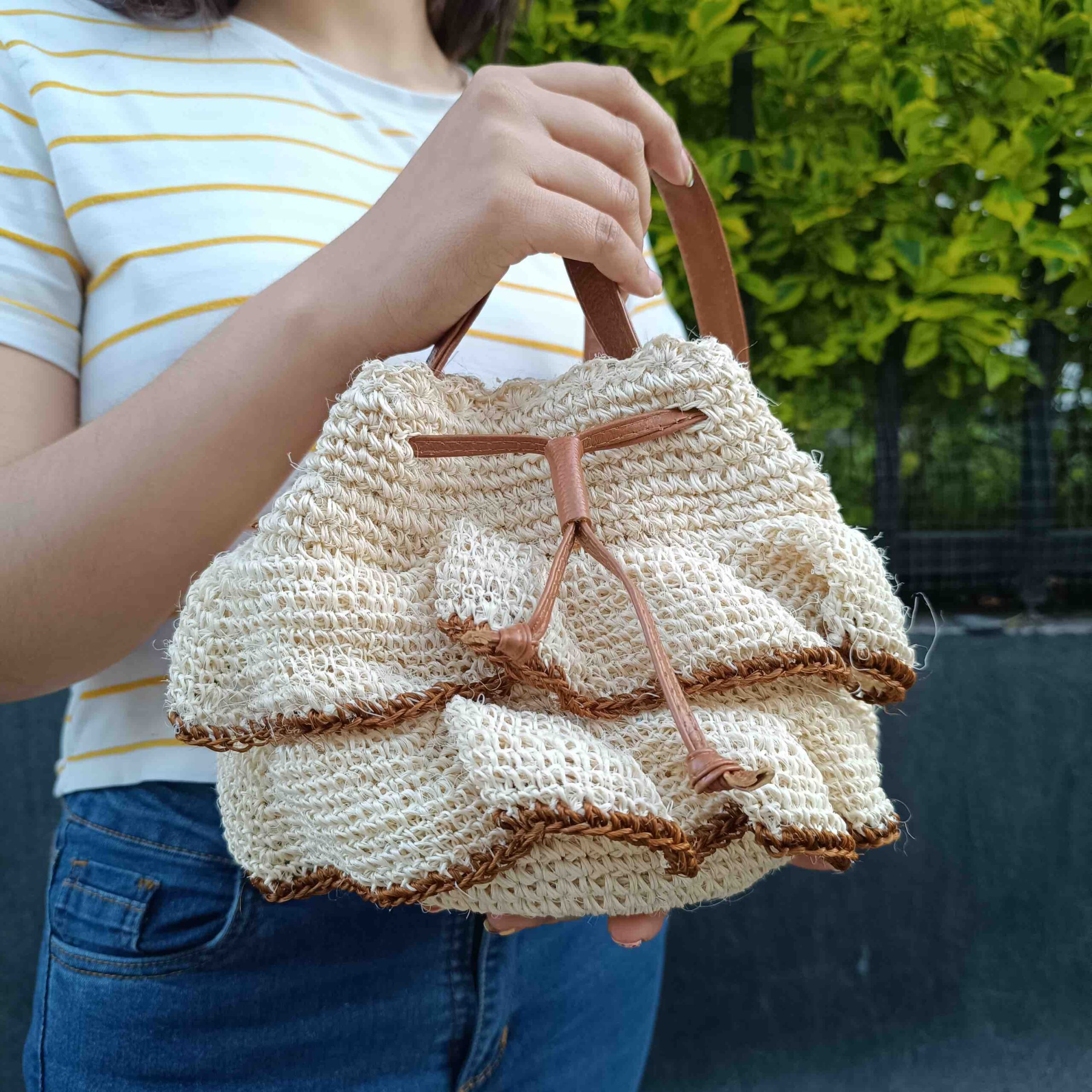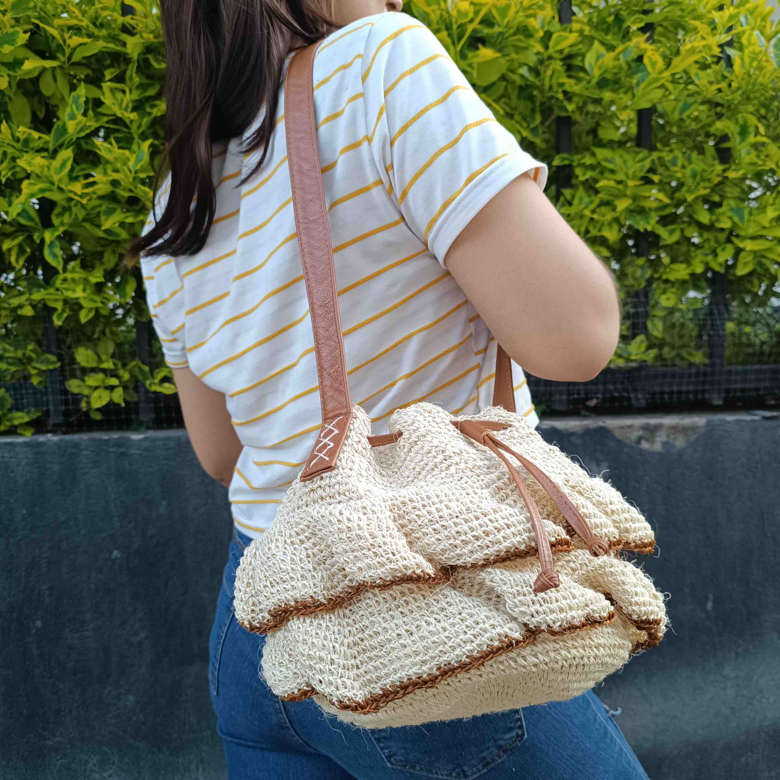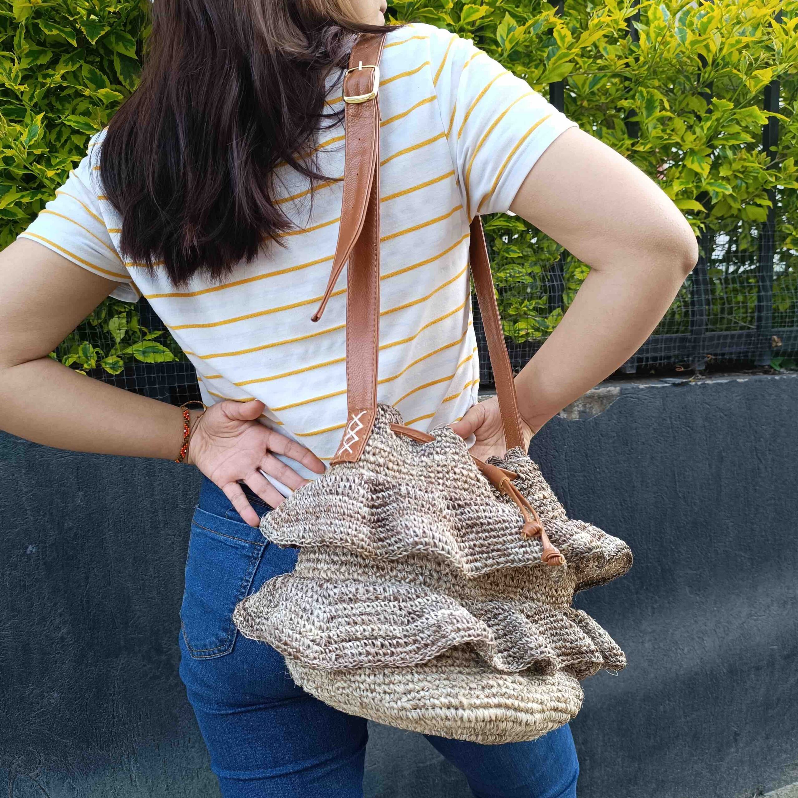 DESCRIPCIÓN:Bolso tejido a mano exclusivamente por artesanas expertas boyacenses, a crochet con capas onduladas a su alrededor.
